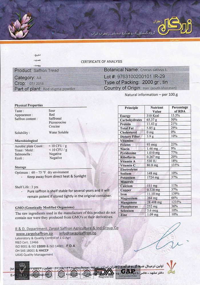 この長い歴史を持つイランのサフラン栽培は化学肥料を一切使うことなく100%有機栽培で人から人へと何世代にも渡って受け継がれ、その品質の良さは国際市場で認められ、中でも当社取扱いのサフランは、その香り、品質の高さから、国際標準化機関である『ISO』によって認可を受けている最高ランクのサフランです。